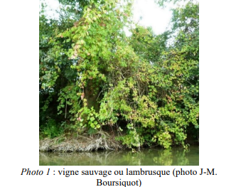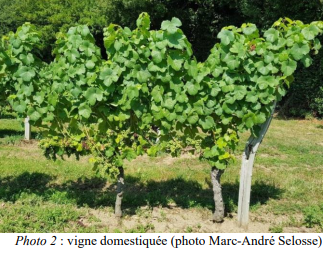 La vigne sauvage (Vitis vinifera variété sylvestris ou lambrusque) est une liane grimpant aux arbres (d’où son nom de sylvestris) dans les forêts riveraines des cours d’eau, ou sur sols profonds. Quand le facteur limitant est la faible lumière, elle le contourne en grimpant jusqu’à la canopée ; en milieux secs, les racines, qui supportent donc de faibles teneurs en oxygène, peuvent aller chercher l’eau très en profondeur (Photo 1). La domestication a métamorphosé la plante : alors que la vigne sauvage comprend des pieds mâles (les fleurs produisent le pollen) et femelles (les fleurs portent un pistil récepteur et des ovules qui se transforment en graine, puis en fruit), la vigne domestiquée est hermaphrodite ; aussi, chacune de ses fleurs portant ovules et pollen, un seul pied donne des fruits. La vigne sauvage produit des petits fruits noirs à petits pépins, épars