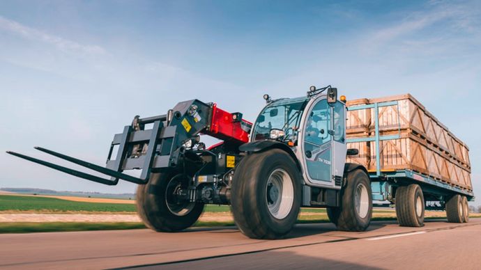 Les télescopiques équipés bénéficient de deux plages de vitesse : « lièvre » (0 à 40 km/h) pour la conduite sur route et « tortue » (0 à 20 km/h) pour le travail en mode chargeur. Le passage de l’une à l’autre peut se faire en marche, via un bouton sur le joystick.