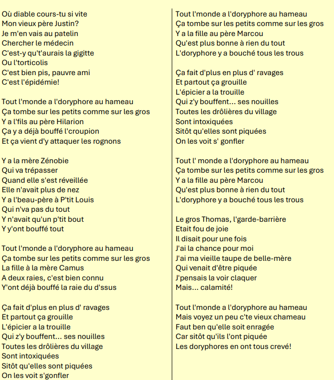 Cette chanson était enseignée aux enfants durant l’Occupation. Elle était à double sens car le qualificatif de doryphore était attribué à l’Occupant, et si nos parents ou grands-parents ont été à cette époque rationnés en pommes de terre, c’est parce qu’elles étaient confisquées par l’armée allemande pour nourrir ses effectifs. Nous n’avons malheureusement pas retrouvé la partition musicale.