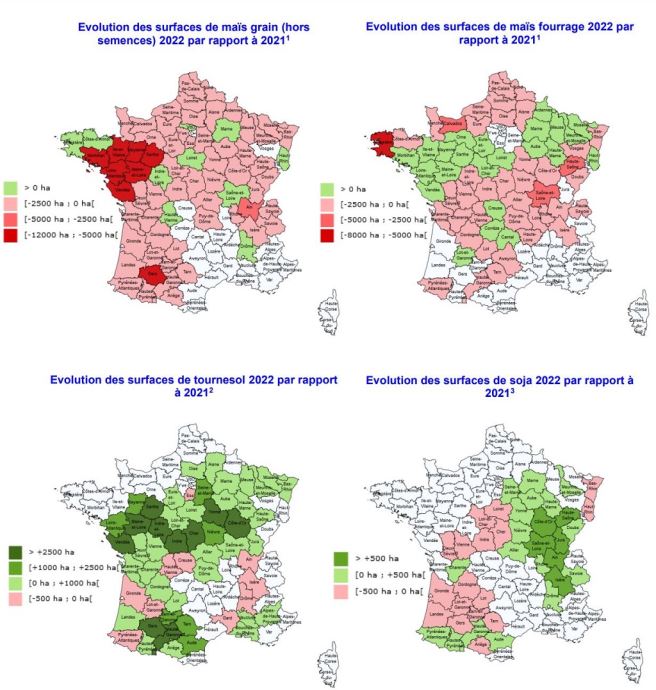 Les surfaces de tournesol progressent « dans les départements où les surfaces de maïs reculent, plus particulièrement dans les régions des Pays de la Loire, du Centre-Val-de-Loire et de Bourgogne-Franche-Comté. En 2022, la sole nationale atteindrait 758 milliers d’hectares : soit + 8,6 % par rapport à 2021 et + 17,8 % par rapport à la moyenne 2017- 2021, sans toutefois atteindre le niveau de 2020 ».