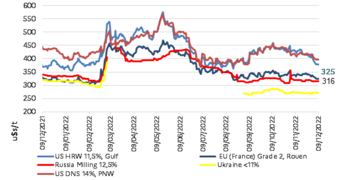 Côté prix, le blé français suit la tendance globale à la baisse de ces dernières semaines, liée au renouvellement du corridor d’export sécurisé qui se solde par une arrivée massive de blés Mer noire sur le marché international, et par l’annonce d’une récolte record en Australie. Dans ce mouvement général de détente, « le blé français est compétitif par rapport à certaines origines », souligne Marc Zribi, notamment nord-américaines.