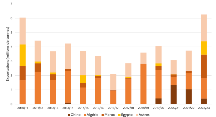 À cinq mois de campagne, ce sont donc l’Afrique du nord et la Chine qui ont dominé les importations de blé tendre français, avec plus de 6 Mt à elles deux… Bien au-dessus des niveaux de ces dernières campagnes à la même période.