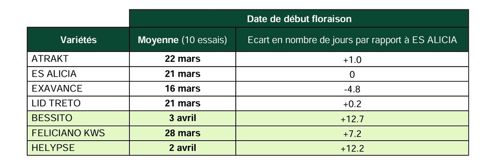 « Le tableau ci-dessous présente la moyenne des écarts par rapport à la variété Es Alicia. Sont également présents dans ce tableau, les 3 hybrides restaurés témoins du réseau VCE (variétés inscrites au catalogue français) Terres Inovia. Feliciano KWS mi-précoce à floraison, Bessito et Helypse mi-tardives à floraison. »