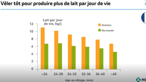 Aussi, le vêlage précoce permet une production de lait plus importante à la fois en première lactation et sur l’ensemble de la carrière de l’animal. « Selon des études canadiennes, pour un vêlage à 22 mois, on a un niveau de production supérieur sur la carrière, et plus on fait vêler tardivement, plus ce rendement laitier par lactation va décroître », assure-t-il.
