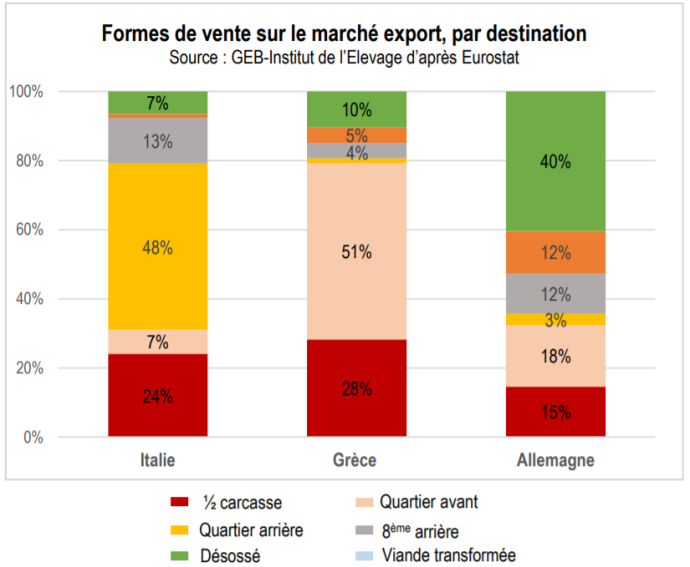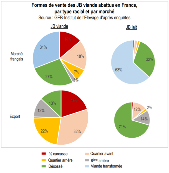 Les jeunes bovins viande sont ensuite écoulés sous forme de demi-carcasse, quartiers et 8e afin de répondre à la demande en viande piécée des professionnels du secteur. Le marché halal français est notamment un moteur important de la demande en viande de JB non désossée.