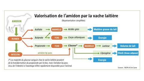 D’autant que le système digestif de la vache lui permet d’assimiler l’amidon à deux endroits différents : via le rumen, et l’intestin. « Un blé sera quasiment digéré intégralement dans le rumen », poursuit la conseillère. La flore microbienne du rumen se charge de transformer l’amidon en acide gras volatils : l’acétate, le propionate et le butyrate.
