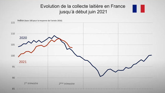 La collecte française apparait particulièrement peu dynamique depuis le début de l’année : « Le pic de collecte sur les quatre premiers mois est sensiblement plus bas qu’en 2020 », néanmoins la production tend depuis quelques semaines à dépasser les niveaux de l’an dernier.