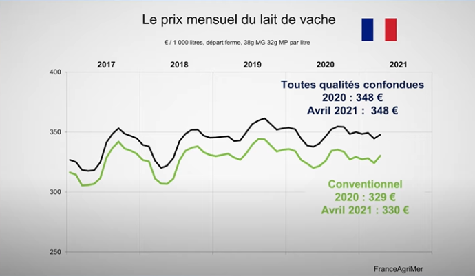 Côté prix du lait, l’enquête laitière mensuelle de FranceAgriMer fait état d’un prix standard du lait de vache conventionnel à 330 euros les 1 000 litres de lait pour le mois d’avril 2021. Soit sept euros de plus qu’en avril 2020.