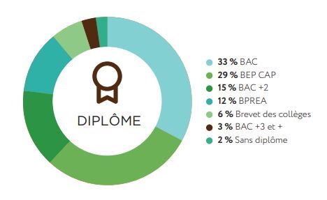 - Diplôme :Bac (33 %) – BEP/CAP (29 %)