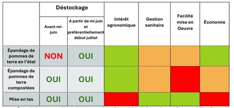 En dernier recours, une dernière voie de dégagement est autorisée pour détruire les surplus de pommes de terre, à savoir la mise en tas. Elle doit « se faire le plus tard possible dans la saison (fin juin/début juillet si possible) notamment pour éviter les foyers actifs de mildiou. Quelques règles simples sont à respecter pour maîtriser le risque sanitaire lié à cette pratique ».