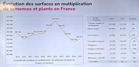« Le nombre de contrats diminue mais les surfaces moyennes des contrats augmentent, il y a un phénomène de concentration, observe Bruno Ferreira, directeur général de l’interprofession. Et les surfaces françaises de semences et plants ont stoppé leur baisse engagée depuis 2022 : 380 411 ha en 2025 contre 376 795 ha en 2024. La sole de multiplication dédiée au lin et au chanvre enregistre une hausse de 18 % sur un an, à l’inverse celle d’oléagineux est en baisse de 16 %. »